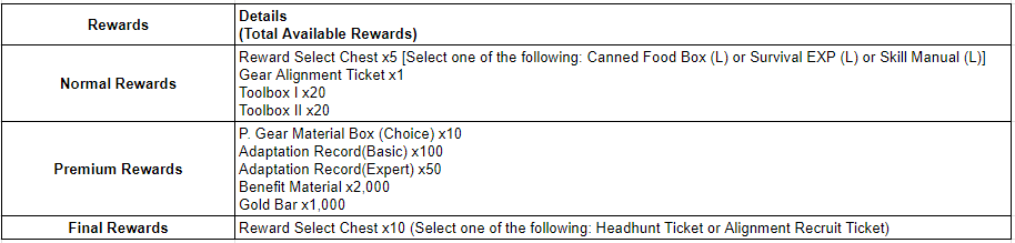 After completing the Survival Record, you may earn Adaptation Record, Toolbox, P. Gear Material Box (Choice), etc.