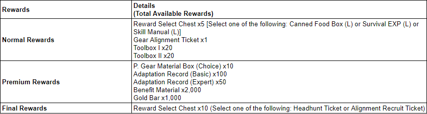 After completing the Survival Record, you may earn Adaptation Record, Toolbox, P. Gear Material Box (Choice), etc.