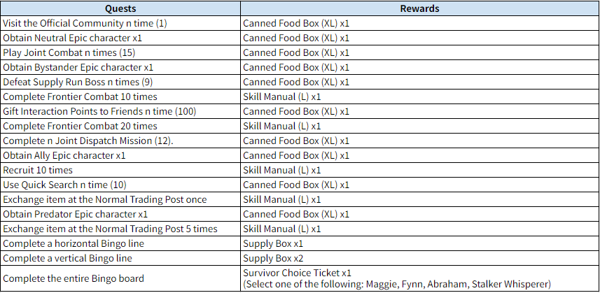Complete missions on the bingo board (3x5) and obtain rewards.
