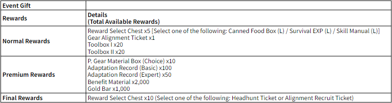After completing the Survival Record, you may earn Adaptation Record, Toolbox, P. Gear Material Box (Choice), etc.