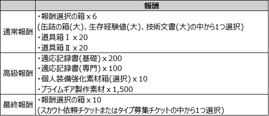 道具箱Ⅰ、適応記録書、プライムギア製作素材など、様々なアイテムも獲得できます。