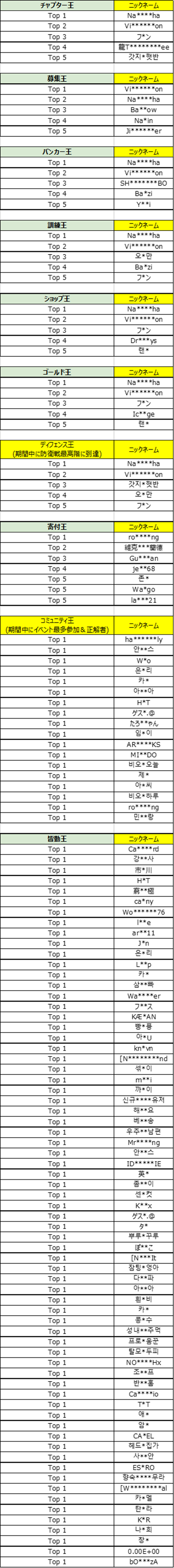 ・選定カテゴリー:チャプター王、募集王、バンカー王、訓練王、ショップ王、ゴールド王、ディフェンス王(期間中に防衛戦最高階に到達)、寄付王、コミュニティ王(期間中にイベント最多参加&正解者)、皆勤王