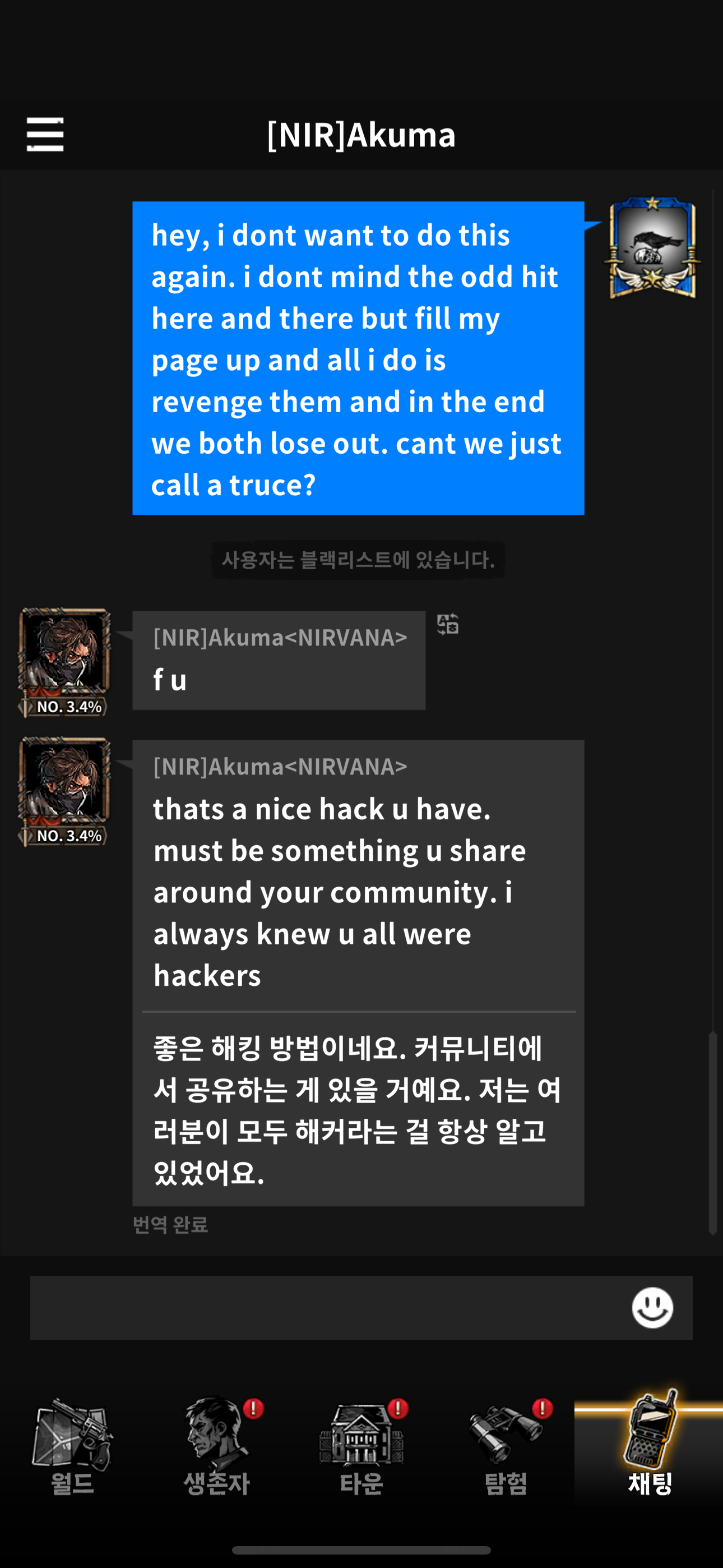 불량 이용자 신고 욕설유저 신고합니드 테니서 (Lv.300) 2025-07-26 09:57 42 0 공유 공유 URL 복사 페이스북 왓츠앱 카카오톡 라인 레딧 닫기 공유 이 사람 욕하고 다니는걸로 유명한데 계속 저러네요? 심지어 저와 저희 길드를 해킹유저로 모함하고 있습니다 빠른 처리 부탁드려요 0 댓글 0
