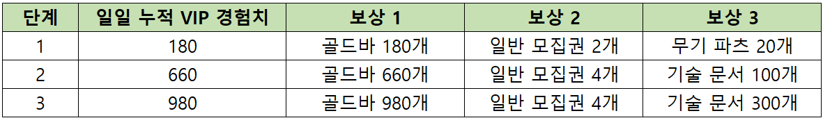 - - 이벤트는 매일 00시 (서버 시간)을 기준으로 당일 획득한 VIP 경험치 누적량과 보상 획득 여부가 리셋됩니다.