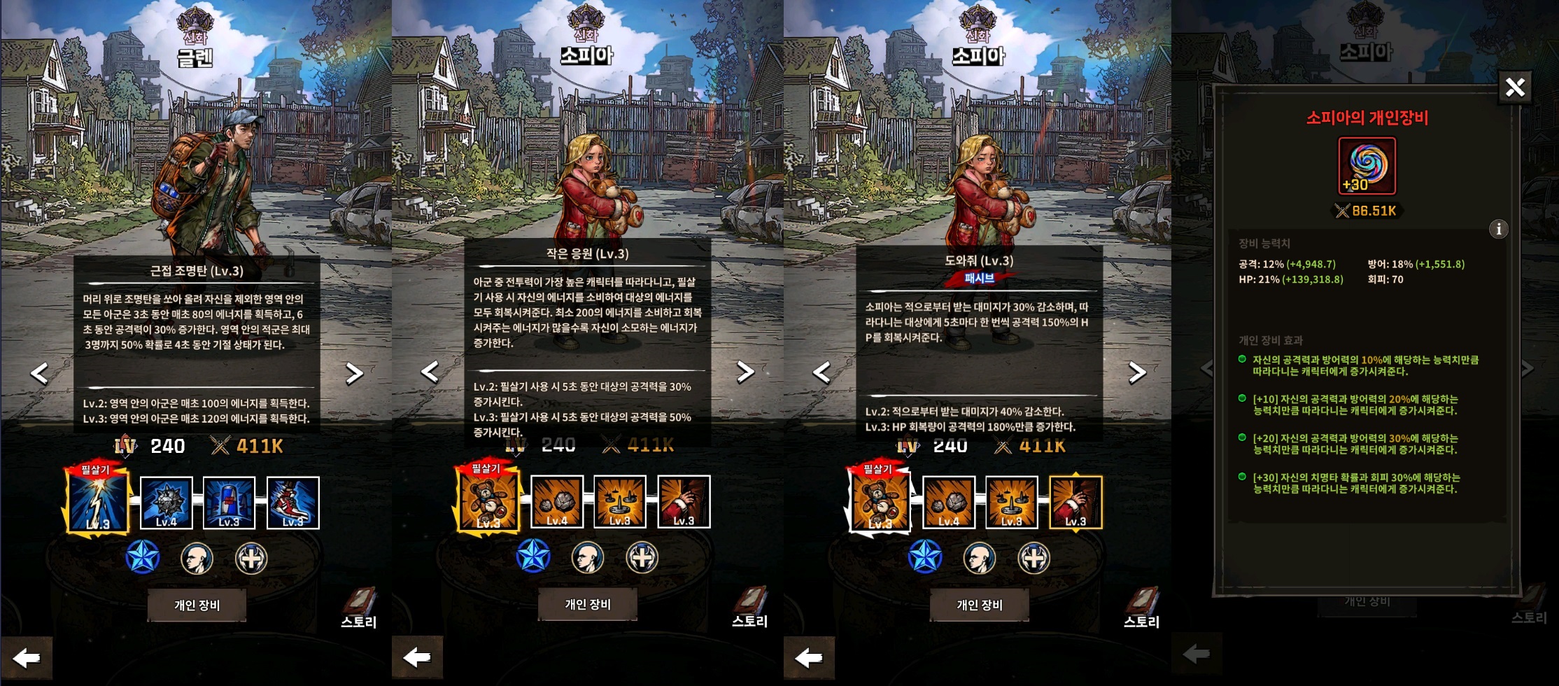 이제 가장 중요한 딜러가 마련되었으니 이를 보조할 인원들을 투입할 차례 입니다. 그리고 그 인원들은 지금도 합동 전투에서 맹활약 중인 글렌, 소피아, 케이트, 에제키엘의 서포터 & 테크니션 부대가 되겠습니다.