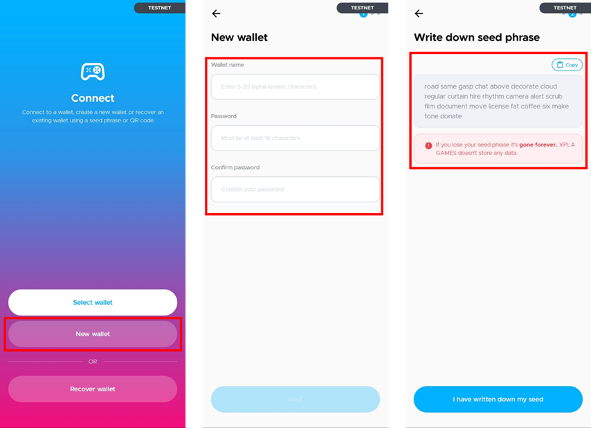 ● หากทำ seed phrase หาย คุณจะไม่สามารถกู้คืนได้อีก โปรดทราบว่า XPLA GAMES จะไม่เก็บข้อมูลดังกล่าว