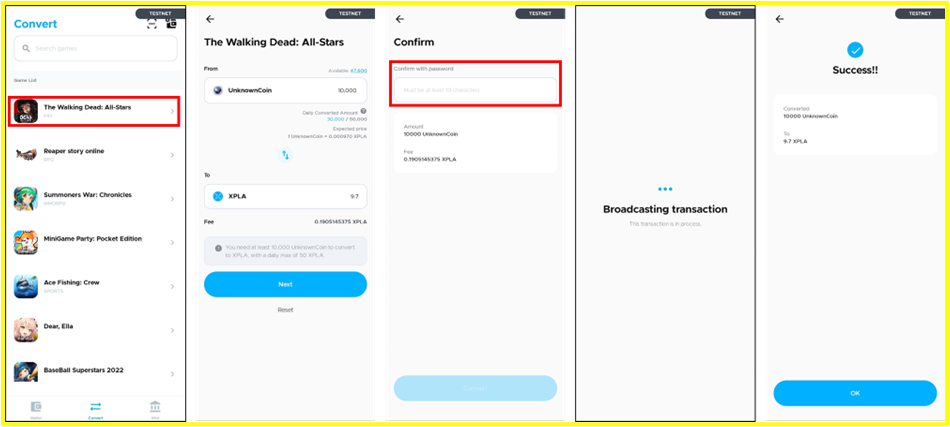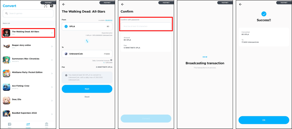 ※ หากมี Unknown Coin ไม่พอ สามารถแปลงเหรียญ XPLA ที่มีเป็น Unknown Coin เพิ่มได้ผ่าน XPLA GAMES Wallet